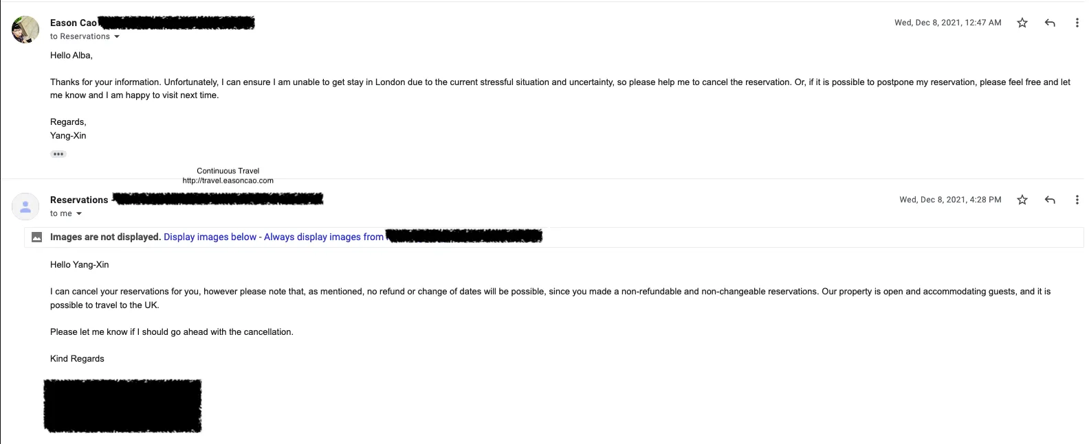 我當時還寫了一封文情並茂的信件,向住宿寫著:親愛的 Host,我真的很想去,但對於疫情的擔憂,因此希望原訂的住宿有改期或是退費的空間 (當然,已經不預期錢拿得回來)。