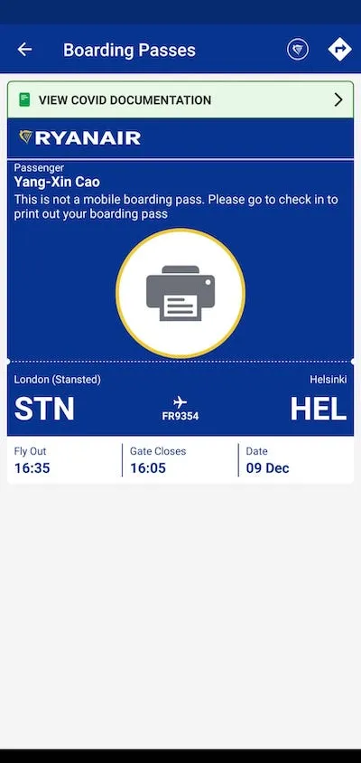 - STN (UK) -> HEL (FI):提示要做 Visa Check,拿手機 App 顯示的要列印訊息,到櫃臺檢查文件跟疫苗護照列印機票