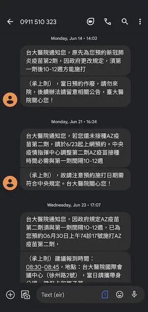 過幾天,人都已經跑到國外,才收到來自台大醫院改期施打第二劑 AZ 疫苗的簡訊,心中當時只有無奈和無力翻的白眼。隨著在歐洲生活遭遇各種麻煩的過程,早已經感到見怪不怪。打開台大醫院的掛號系統,將被改期的疫苗取消。