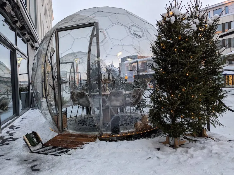但再怎麼興奮,肚子還是會餓。於是我們一群人就打開 Google Map 隨便找了附近的餐廳,還沒進門,首先吸引我們的不是食物,而是夢幻的玻璃球戶外用餐區: