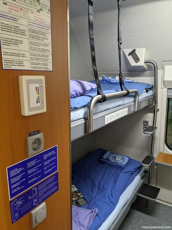 搭上 VR 列車前往聖誕村 (Santa Claus Village) 的夜班臥鋪列車,不禁瞬間讓人勾起當兵那段糟糕的體驗。但沒想到格外的舒適且乾淨,真實體驗過後比軍中的臥鋪好睡: