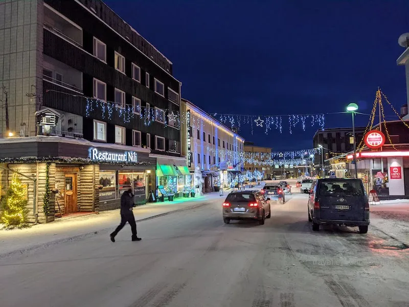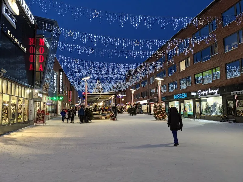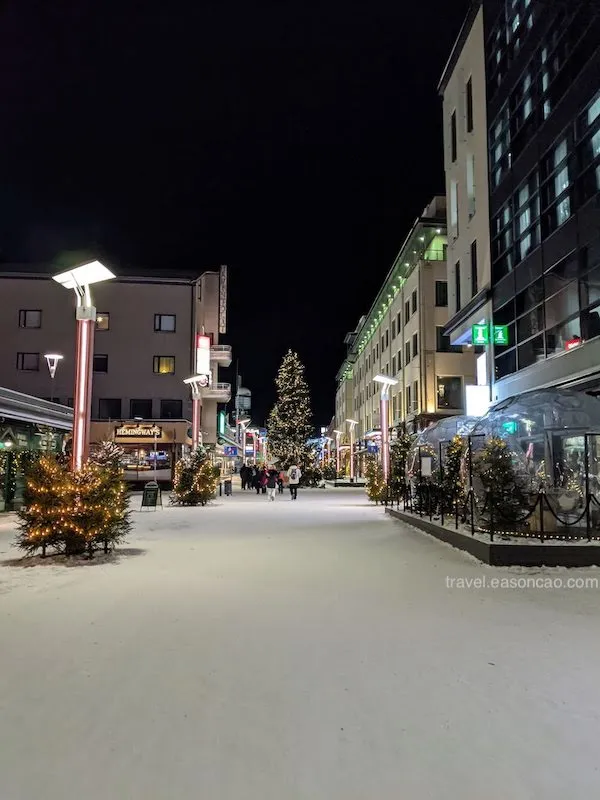 唯一的衝突感是冬天接近北極圈的日照時間超!級!短!我們剛到大概上午 11 點太陽就要下山了,到下午平常還在吃午餐的時間,天色卻早已漸暗,有一種不知道是在吃午餐還是晚餐的錯覺。不過,到了晚上商店和街上絢麗的燈光卻也點綴了單調的雪白,到處充斥了各種顏色: