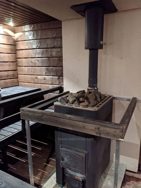 可惜晚上多雲偶飄雪,錯過了看極光的最佳天氣狀況。不過,我在這體驗到了人生中的第一次超級傳統的 Finnish Sauna,柴火不夠還可以自己添的那種。在炭火燒熱的石塊上淋上一瓢水,瞬間產生大量的蒸氣佈滿整室: